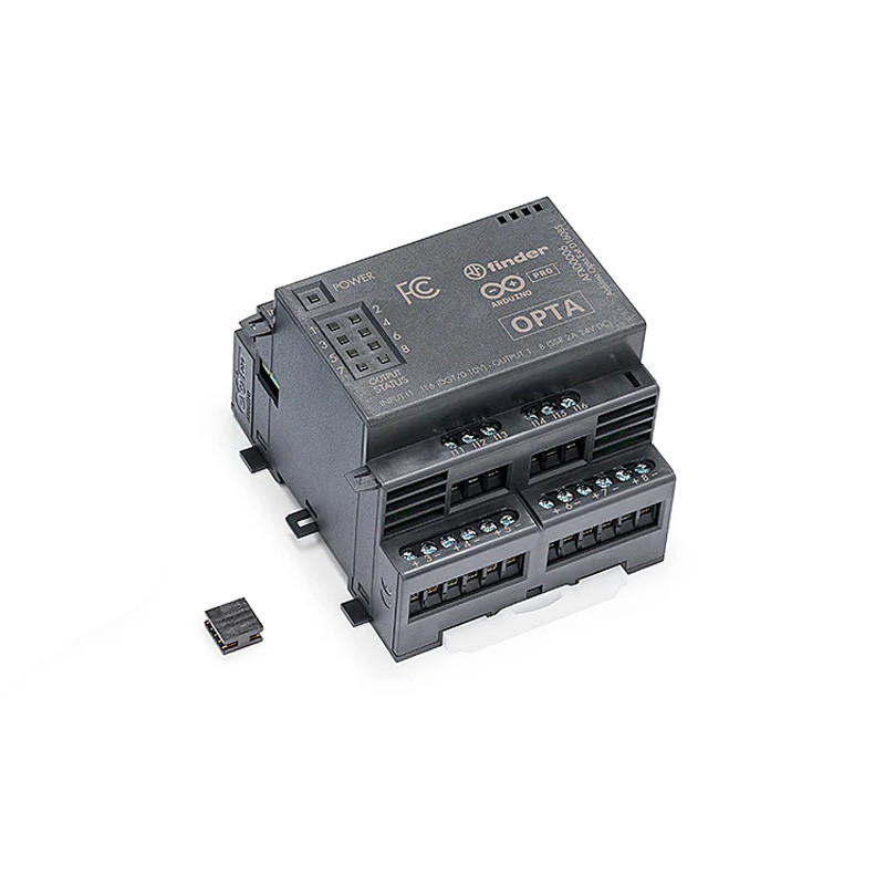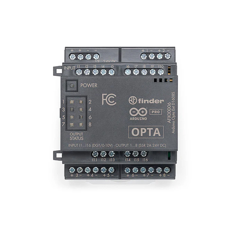 The Arduino Pro Opta Ext D1608S (AFX00006) is a snap-on expansion module for the Opta micro-PLC, adding 16 programmable voltage inputs (digital 0–24 V or analog 0–10 V) and 8 solid-state relays (24 V DC, 2 A).